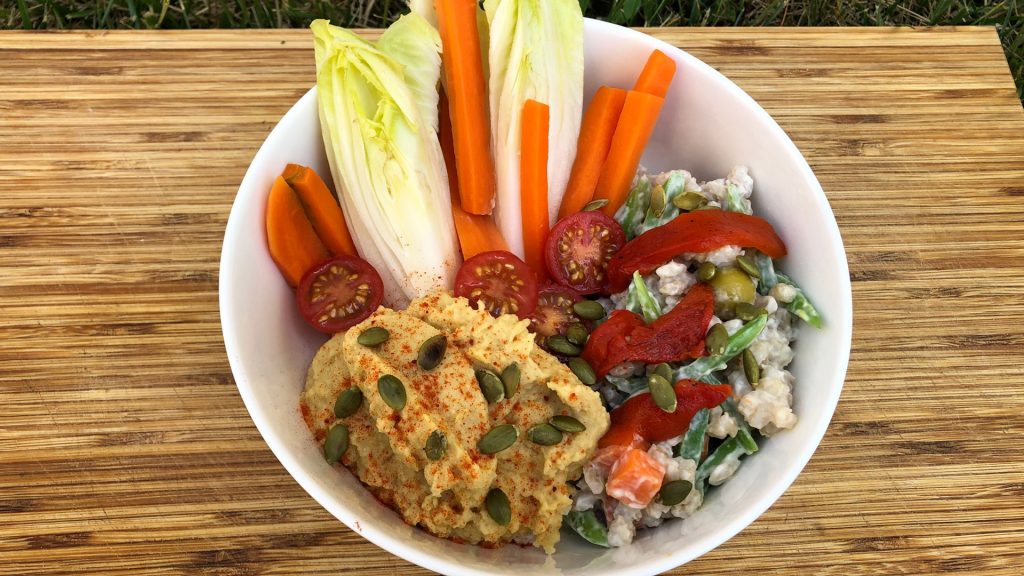 4. Poner la cebada cocida en un bol junto con las zanahorias, las judías verdes y las olivas.