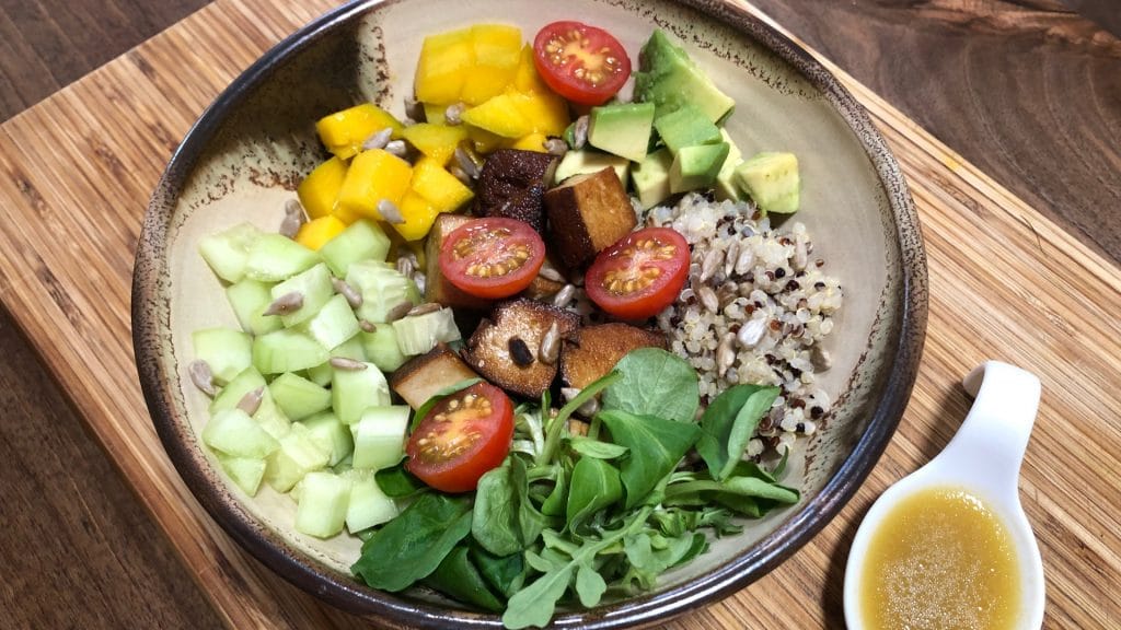 - Una vez la quinoa haya enfriado, colocar en el bowl y añadir el pepino, los tomates cherry, el aguacate, el mango y las hojas verdes.